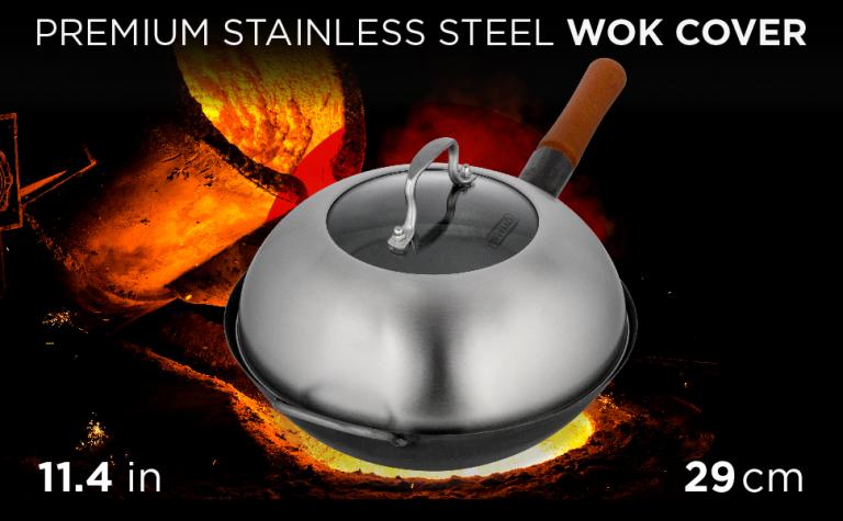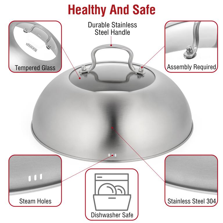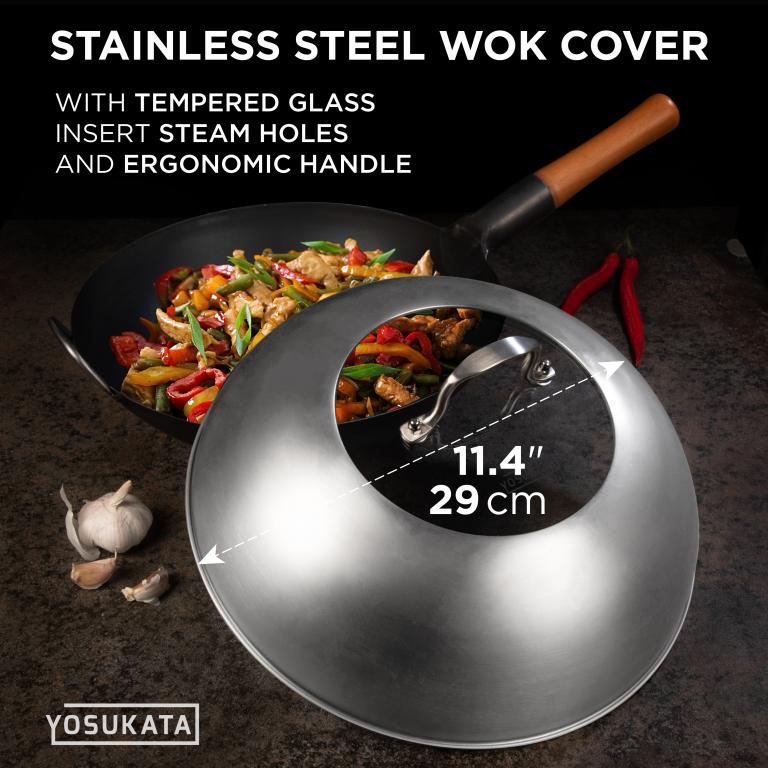 YOSUKATA Wok Lid 11.4 In - Premium Stainless Wok Cover with Tempered Glass Insert Steam Holes and Ergonomic Handle - Durable Wok Accessories - Dishwasher-Safe Lid for 11.8-In Wok - Chees Melting Dome Improved design: The steam holes on our lid slowly release inside pressure to prevent splatters and burns. Order our wok lid dome with tempered glass to professionalize your cooking Versatile: Our 11.4 wok cover lets you steam or sear without splattering. It can also be used as a cheese melting dome on a grill, a burger cover, or a basting cover to keep food tasty and warm Get better control: Unlike a traditional wok lid, our 11.4 wok lid cover has a tempered glass insert, so you can see what's happening inside without lifting it. The ergonomically designed steel handle is easy to hold Sturdy and dishwasher safe: Our wok cover for 11.8 inch woks is made of long-wearing stainless steel. This steel wok cover lid does not have an artificial coating that can leach into your food Maximize your wok's functionality: Our stainless steel 11.4 inch lid cover traps and distributes heat evenly for more efficient cooking. These wok utensils concentrate all the flavors, so your food tastes better