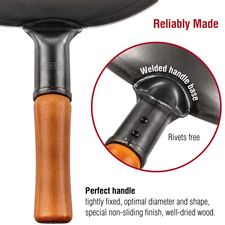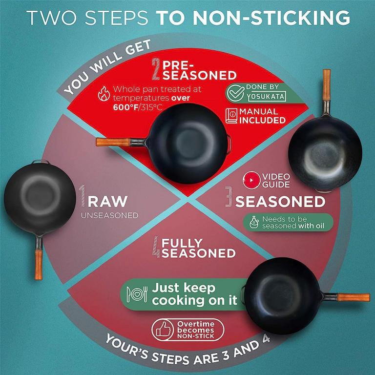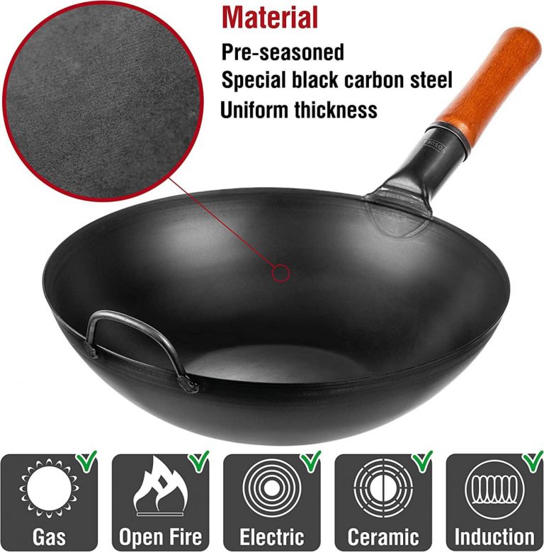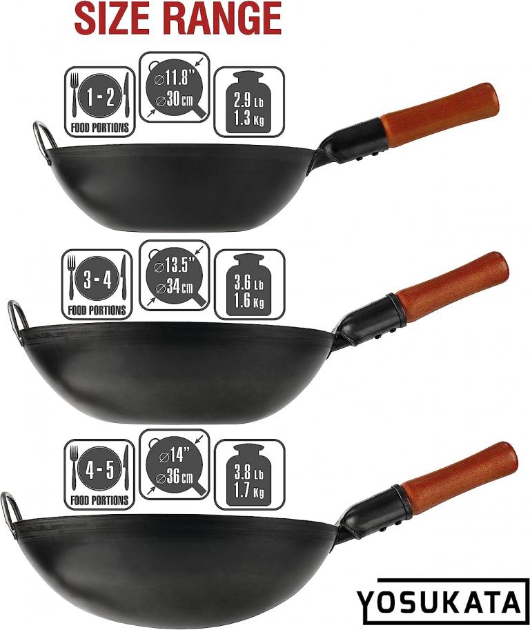 GENUINE TASTE: Discover the rich, authentic flavors of Chinese and other Asian cuisines in your own home. The Yosukata 13,5 inch wok with flat bottom is specially designed to lock the juice and flavor inside ingredients PRE-SEASONED: Our carbon steel wok is pre-seasoned at high temperatures using special technics, unlike unseasoned woks and stir fry pans. Don’t worry about pre-seasoning your Chinese wok anymore HIGH-QUALITY MATERIALS: This large wok pan is made from heavy-duty, black carbon steel. The ergonomic design of the wooden handle ensures a comfy grip when you use this pow wok VERSATILITY: In addition to stir-frying, with the Yosukata carbon wok pan, you can cook healthy meals using various traditional cooking techniques like pan-frying, braising and deep-frying EASY HANDLING and STORAGE: Our steel wok is convenient to carry and easy to store