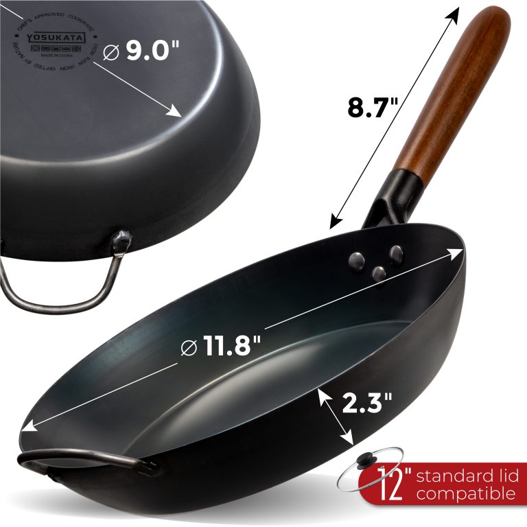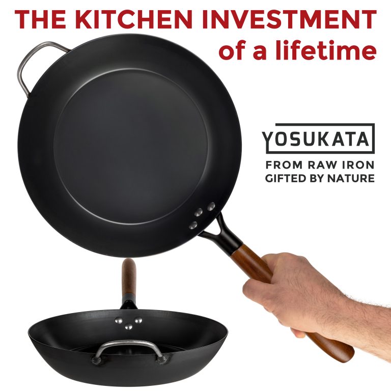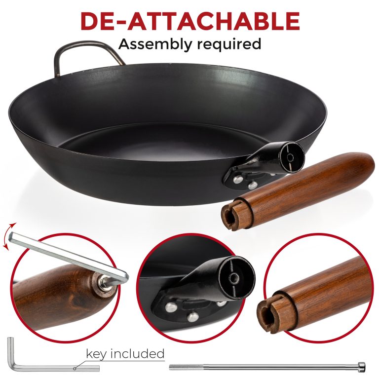 No harm: Unlike a standard nonstick pan, our black carbon steel skillet has no artificial coating, so no unwanted elements can leach into food while cooking. Safe frying pans for healthy meals. Thoughtful design: High-quality carbon steel makes our bacon pan more durable than a standard stainless steel skillet. Enjoy using this large frying pan for a lifetime. Use lightweight pans for cooking every day. Your skillet pan for any dish: Our carbon steel frying pan / big pan heats up quickly and evenly so that you get the perfect cooking temperature in no time. Practical steel pan, deep fry pan for all stovetops. The removable wooden handle of this stir fry pan always stays cool. Our cooking pans protect your hands from burns. Unlike typical stainless steel cookware or woks & stir-fry pans, detach the handle to make it oven-ready. Order our attractively priced 30 cm (11.8 inch) pan, black carbon steel frying pan, and enjoy healthy and delicious cooking in the best cooking pan ever!