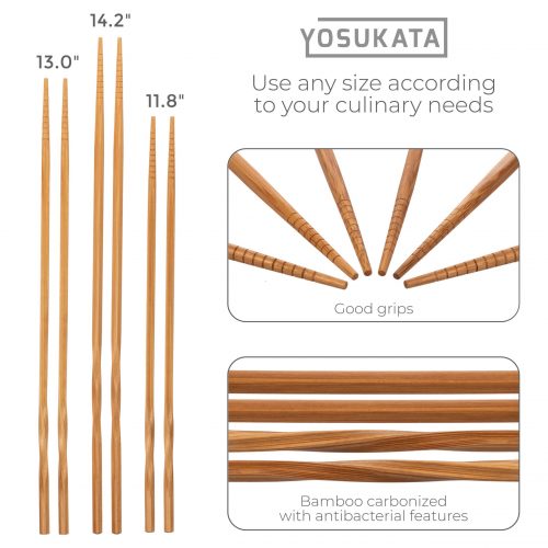 Universal wok tools set: The YOSUKATA wok utensils set professional kit includes 17-inch pre-seasoned spatula and ladle, and 3 pairs of wooden cooking frying chopsticks of various lengths (13’’/14.2’’/11.8’’), so you can cook any authentic Asian recipe with joy and ease.