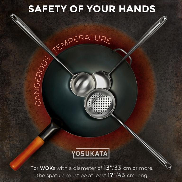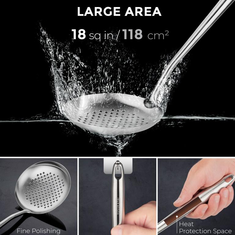 Ergonomic Design and Heat-Resistant: These wok utensils, measuring 17 inches long, offer excellent heat resistance. The handles stay cool, ensuring the chef's hands remain safe while cooking. The metal cooking utensils in our set come with a built-in hole in the handle for easy hanging storage. Universal Kitchen Essentials: The package includes a ladle, spatula and skimmer, catering to all your cooking needs. Use your wok skimmer spoon, soup ladle and wok spatula whether you're stir-frying, flipping, or scooping. This set has got you covered. Versatile Wok Tools: With thin, smooth edges, each tool is finely curved to complement various woks - be they carbon steel, cast iron, or any other material. Ideal for home and commercial professional use, these Chinese kitchen utensils are a must-have for fans of Asian culinary delights. Durable 304 Stainless Steel Cookware: Crafted from high-quality 304 stainless steel, these chemical free cooking utensils are rust-proof and corrosion-resistant, guaranteeing a perfect blend of strength and durability for your kitchen! Dishwasher Safe Cooking Utensils Set: After enjoying your delicious creations, simply place the cooking stuff in the dishwasher for hassle-free cleaning. A practical and convenient choice for any kitchen!